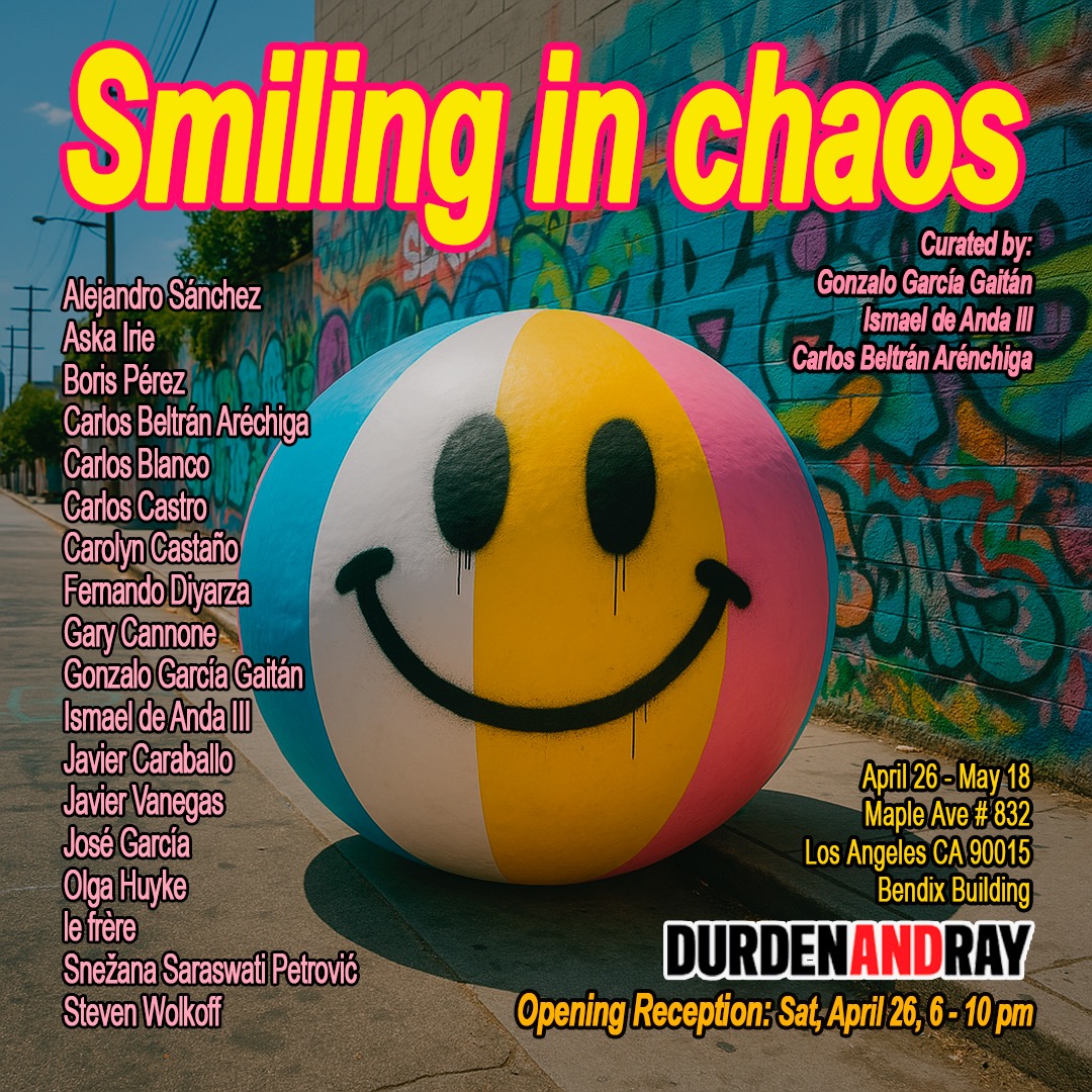 Smiling in Chaos is a collaboration between Si Nos Pagan Boys, a Colombian collective of artists who infuse art with fun and humor, together with Los Angeles based artists, and one Spanish artist, who also use humor and levity in their work as a form of resistance.
